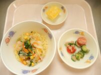 本日の給食は・・・ *ちゃんぽん 〈麺・ごま油・バナエイエビ・豚肉・玉ねぎ・キャベツ・もやし・にんじん・なると・ねぎ・小松菜・コーン・鶏がらだし汁・かつお昆布だし・中華だし・醤油・酒・にんにく・生姜・牛乳〉 *ミニトマトの中華サラダ 〈ミニトマト・きゅうり・ツナ・ごま油・醤油・中華だし・ごま〉 *パイン 本日のおやつは・・・ ◆牛乳 ◆のり塩ガレット 〈じゃがいも・片栗粉・とろけるチーズ・あおのり・中華だし・塩〉