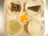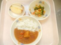 本日の給食は… *カレーライス 〈米・豚もも肉・玉ねぎ・人参・じゃがいも・なたね油・バター・牛乳・スキムミルク・水・カレールウ・ケチャップ・中濃ソース〉 *ブロッコリーのサラダ 〈ブロッコリー・人参・コーン・酢・しょうゆ・三温糖・なたね油〉 *りんご 本日のおやつは… ◆麦茶 ◆ベーコンチーズおにぎり 〈米・ベーコン・小松菜・なたね油・チーズ・かつお節・しょうゆ・和風だしの素〉 本日の中期離乳食は… ○粥 ○じゃがいものそぼろ煮 〈鶏ひき肉・じゃがいも・かつおだし〉 ○ゆでブロッコリー ○スープ