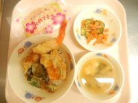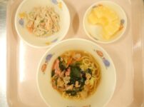 本日の給食は… *醤油ラーメン 〈生中華麺・豚バラ肉・キャベツ・玉ねぎ・人参・ねぎ・ほうれん草・もやし・なると・しょうが・にんにく・焼きのり・鶏がらだし汁・かつお昆布だし汁・中華だしの素・醤油・ごま油〉 *切干大根の味噌マヨサラダ 〈切干大根・人参・きゅうり・ツナ水煮・白みそ・マヨドレ・酢・三温糖・すりごま〉 *パイン缶 本日のおやつは… ◆牛乳 ◆焼きいも 本日の中期離乳食は… 〇粥 〇鶏肉とキャベツの煮物 〈鶏ひき肉・キャベツ・かつおだし・醤油〉 〇きゅうりの和え物 〈きゅうり・人参・塩〉 〇スープ