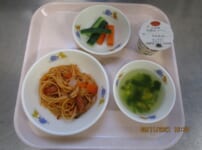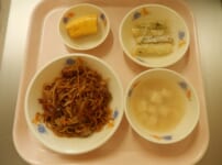 本日の給食は… *ソース焼きそば <焼きそばめん・豚もも肉・たまねぎ・にんじん・キャベツ・もやし・あおのり・ウスターソース・オイスターソース・しょうゆ・塩・油> *青のりポテト <じゃがいも・あおのり・塩・しょうゆ> *ごまみそスープ <鶏ひき肉・もやし・木綿豆腐・おろしにんにく・水・ごま油・牛乳・すりごま・白みそ・しょうゆ・中華だしの素> *バナナ 本日のおやつは… ◆牛乳 ◆ごはん磯部もち <米・バター・しょうゆ・焼きのり> 本日のごっくん期の離乳食は… 〇つぶしうどん 〇木綿豆腐 〇じゃがいも 〇キ ...