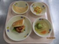 本日の給食は… *チャイニーズチキンバーガー <中力粉・ドライイースト・塩・さとう・牛乳・バター・牛乳・ごま・鶏もも肉・塩・酒・片栗粉・米粉・油・しょうゆ・さとう・酢・みりん・レタス・マヨドレ> *ラキポテ <じゃがいも・片栗粉・油・塩・牛乳・小麦粉・とろけるチーズ・洋風だしの素・中濃ソース・ケチャップ・中華だしの素・小麦粉・さとう・粉チーズ・塩・洋風だしの素> *小松菜のソテー <小松菜・コーン・バター・塩> *マカロニスープ <マカロニ・にんじん・たまねぎ・じゃがいも・ブロッコリー・洋風だしの素・さと ...