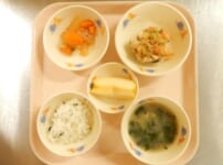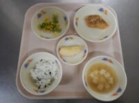 本日の給食は… *わかめご飯 *さばのマリネ 〈さば・塩・おろししょうが・片栗粉・小麦粉・油・トマト・きゅうり・たまねぎ・三温糖・酢・オリーブ油〉 *大根の煮物 〈大根・人参・かつお昆布だし汁・しょうゆ・みりん・酒・三温糖・塩・万能ねぎ〉 *みそ汁 〈煮干しだし汁・味噌・ほうれん草・木綿豆腐〉 *りんご 本日のおやつは… ◆牛乳 ◆ピザまん 〈小麦粉・三温糖・塩・ドライイースト・ベーキングパウダー・スキムミルク・油・豚ひき肉・たまねぎ・トマトピューレ・ケチャップ・中濃ソース・洋風だし汁・塩・小麦粉・とろけ ...