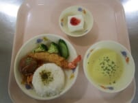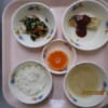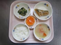本日の給食は… *ごはん *ほっけの竜田揚げ <ほっけ・塩・こしょう・しょうが・しょうゆ・酒・片栗粉・油> *ほうれん草のなめたけ和え <ほうれん草・えのき・しょうゆ・酒・みりん・砂糖・酢> *みそ汁(キャベツ・人参) *みかん 本日のおやつは… ◆牛乳 ◆フルーツサンド <食パン・いちご・生クリーム・クリームチーズ・グラニュー糖・もも缶> 本日のカミカミ期の離乳食は… 〇軟飯 〇ほっけの竜田揚げ <ほっけ・塩・片栗粉・油> 〇ほうれん草のなめたけ和え <ほうれん草・えのき・しょうゆ・砂糖> 〇みそ汁(キ ...