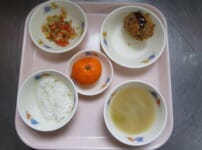 本日の給食は… *ごはん *ビーフコロッケ <じゃがいも・塩・こしょう・牛ひき肉・玉葱・しょうゆ・砂糖・酒・みりん・小麦粉・片栗粉・水・パン粉・油・ソース> *キャベツのごま和え <キャベツ・人参・コーン・すりごま・醤油・砂糖> *みそ汁(わかめ・白菜) *みかん 本日のおやつは… ◆牛乳 ◆れんこんチーズガレッド <れんこん・ツナ・片栗粉・塩・粉チーズ・チーズ・油> 本日のカミカミ期の離乳食は… 〇軟飯 〇ビーフコロッケ湯通し <じゃが芋・牛ひき肉・玉葱・醤油・塩・砂糖・小麦粉・パン粉・油> 〇キャベツ ...
