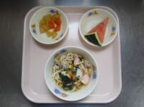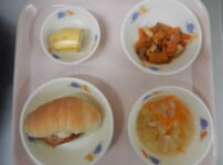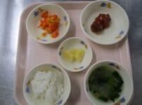 本日の給食は… *ごはん *ミートボール <豚ひき肉・高野豆腐・玉ねぎ・塩・こしょう・パン粉・小麦粉・水・トマト缶・ケチャップ・砂糖・ソース> *人参ソテー <人参・コーン・オリーブ油・塩・こしょう・チーズ・コンソメ> *レタススープ <レタス・小松菜・コンソメ・塩・水> *パイン缶 本日のおやつは… ◆牛乳 ◆ココア蒸しパン <ココア・ホットケーキミックス・砂糖・ベーキングパウダー・バター・牛乳> 本日のごっくん期の離乳食は… 〇つぶし粥 〇しらす 〇玉ねぎ・人参 〇スープ 本日のモグモグ期の離乳食は… ...