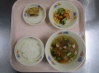 本日の給食は… *ごはん *炒り鶏 〈鶏もも肉・高野豆腐・干ししいたけ・玉ねぎ・ごぼう・人参・たけのこ・板こんにゃく・なると・さやえんどう・しょうゆ・みりん・酒・三温糖〉 *ほうれん草の納豆和え 〈ほうれん草・ひきわり納豆・人参・しょうゆ・三温糖・焼きのり〉 *みそ汁 〈油揚げ・大根・白みそ・煮干しだし汁〉 *パイン 本日のおやつは… ◆牛乳 ◆ボンボローニ 〈強力粉・三温糖・塩・ドライイースト・かぼちゃ・牛乳・バター・なたね油・生クリーム・グラニュー糖〉 本日のもぐもぐ期離乳食は… 〇粥 〇炒り鶏 〈鶏 ...