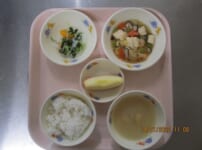 本日の給食は… *ごはん *豆腐の野菜あんかけ風 <木綿豆腐・えび・椎茸・白菜・人参・グリンピース・かつお節・水・しょうゆ・塩・砂糖・しょうが・片栗粉・水> *はるさめ酢の物 <はるさめ・きゅうり・わかめ・酢・砂糖・塩・みかん缶> *みそ汁(大根・油揚げ) *りんご 本日のおやつは… ◆牛乳 ◆ホットケーキ <ホットケーキミックス・豆乳・水> 本日のかみかみ期の離乳食は… ▽軟飯 ▽豆腐の野菜あんかけ <木綿豆腐・椎茸・白菜・人参・かつお節> ▽海藻サラダ <きゅうり・わかめ> ▽みそ汁(大根・油揚げ) ...