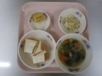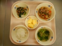 本日の給食は… *ごはん *肉じゃが <豚もも肉・じゃがいも・たまねぎ・にんじん・いんげん・しらたき・かつおだし汁・しょうゆ・酒・みりん> *納豆和え <納豆・ほうれんそう・しょうゆ・和風だしの素・かつお節> *みそ汁 <白みそ・だいこん・こまつな・煮干しだし汁> *パイン 本日のおやつは… *牛乳 *ショートケーキ <小麦粉・三温糖・ベーキングパウダー・なたね油・牛乳・生クリーム・グラニュー糖・いちご> 本日のごっくん期の離乳食は… 〇つぶし粥 〇しらす 〇じゃがいも 〇だいこん 〇スープ 本日のもぐも ...