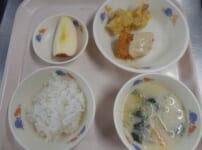本日の給食は・・・ *ごはん *かれいのタルタルフライ 〈かれい・塩・小麦粉・パン粉・玉ねぎ・マヨドレ・三温糖・酢・しょうゆ〉 *ジャーマンポテト 〈じゃがいも・玉ねぎ・ウインナー・コーン・オリーブ油・にんにく・コンソメ・塩・パセリ〉 *豆乳味噌ポトフ 〈かぼちゃ・ブロッコリー・にんじん・小松菜・しめじ・玉ねぎ・豆乳・白みそ・コンソメ・塩・バター・スキムミルク・にんにく〉 *りんご 本日のおやつは・・・ ◆牛乳 ◆ナポリタン 〈スパゲティ・玉ねぎ・ピーマン・にんじん・ベーコン・ケチャップ・中濃ソース・バタ ...