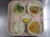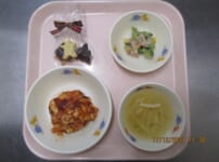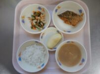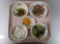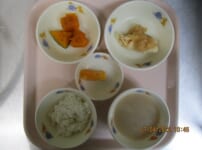 本日の給食は… *ごはん *炒り鶏 <鶏肉・高野豆腐・干し椎茸・人参・玉ねぎ・ごぼう・たけのこ・つきこんにゃく・なると・さやえんどう・醤油・砂糖・みりん・酒・油> *トマトと塩昆布のサラダ <トマト・きゅうり・塩昆布・ごま油・塩・酢・砂糖・鶏がら> *みそ汁(キャベツ・えのき・わかめ) *オレンジ 本日のおやつは… ◆牛乳 ◆カレービーフン <ビーフン・豚肉・えび・キャベツ・人参・ピーマン・油・塩・こしょう・コンソメ・カレー粉> ※完了期はえび除去 本日のごっくん期の離乳食は… 〇つぶし粥 〇高野豆腐 〇 ...