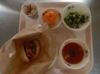 本日の給食は… *チャイニーズチキンバーガー <中力粉・ドライイースト・塩・さとう・牛乳・バター・牛乳・ごま・鶏もも肉・塩・酒・片栗粉・米粉・油・しょうゆ・さとう・酢・みりん・レタス・マヨドレ> *ラキポテ <じゃがいも・片栗粉・油・塩・牛乳・小麦粉・とろけるチーズ・洋風だしの素・中濃ソース・ケチャップ・中華だしの素・小麦粉・さとう・粉チーズ・塩・洋風だしの素> *小松菜のソテー <小松菜・コーン・バター・塩> *マカロニスープ <マカロニ・にんじん・たまねぎ・じゃがいも・ブロッコリー・洋風だしの素・さと ...