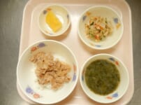 本日の給食は… *鮭ご飯 〈米・鮭・ごま・塩〉 *がめ煮 〈鶏もも肉・人参・れんこん・里芋・ごぼう・つきこん・干し椎茸・かつお昆布だし・しょうゆ・酒・みりん・三温糖・さやえんどう〉 *きゅうりとわかめの酢の物 〈きゅうり・カットわかめ・酢・三温糖・塩・ごま油〉 *みそ汁 〈油揚げ・大根・ほうれん草・白みそ・煮干しだし汁〉 *バナナ 本日のおやつは… ◆牛乳 ◆ビスケットケーキ 〈ビスケット・牛乳・生クリーム・グラニュー糖・いちごジャム〉 本日のごっくん期給食は… ◎粥 ◎ペースト 〈高野豆腐・大根・きゅう ...