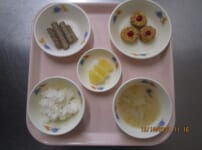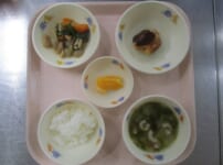 本日の給食は… *ごはん *松風焼き <鶏ひき肉・豚ひき肉・にんじん・たまねぎ・おろししょうが・みりん・白みそ・しょうゆ・パン粉・なため油・ごま> *ほうれん草の納豆和え <ほうれん草・挽きわり納豆・釜揚げしらす・にんじん・しょうゆ・三温糖・焼きのり> *お吸い物 <かつお・昆布だし汁・塩・しょうゆ・えのきたけ・たけのこ・カットわかめ> *オレンジ 本日のおやつは… ◆牛乳 ◆塩パン <強力粉・ドライイースト・三温糖・塩・牛乳・無塩バター・バター> 本日のもぐもぐ期の給食は… 〇粥 〇松風焼き <鶏ひき肉 ...