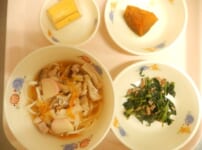 本日の給食は… *醤油ラーメン <生中華麺・豚もも肉・豚バラ肉・ほうれん草・きゃべつ・もやし・にんじん・かまぼこ・ねぎ・ごま油・鳥がらだし汁・かつお昆布だし汁・中華だしの素・しょうゆ・塩> *小松菜のごま和え <小松菜・にんじん・しめじ・さとう・しょうゆ・塩・すりごま> *やきいも <さつまいも> *りんご 本日のごっくん期の離乳食は… ○つぶしうどん ○ほうれん草 ○さつまいも ○高野豆腐 ○スープ 本日のかみかみ期の離乳食は… ○和風うどん <うどん・豚もも肉・豚バラ肉・きゃべつ・にんじん・鶏がらだし ...