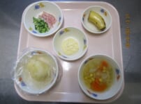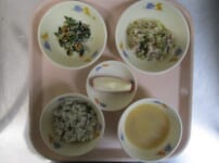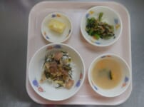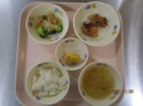本日の給食は… *やきとり弁当 <米・焼きのり・豚もも肉・豚かた肉・ねぎ・しょうゆ・酒・さとう・みりん・みずあめ> *小松菜のカレー炒め <小松菜・もやし・にんじん・ハム・油・カレー粉・しょうゆ・塩> *みそ汁 <かぼちゃ・たまねぎ・白みそ・煮干しだし汁> *パイン 本日のごっくん期の離乳食は… ○つぶし粥 ○にんじん ○かぼちゃ ○スープ 本日のかみかみ期の離乳食は… ○ごはん ○豚肉とねぎの煮物 <豚もも肉・豚かた肉・ねぎ・しょうゆ・酒・さとう> ○小松菜の炒めもの <小松菜・もやし・にんじん・油・し ...