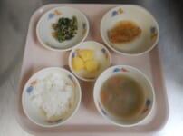 本日の給食は… *ご飯 *チキンナゲット 〈鶏ひき肉・木綿豆腐・おろしにんにく・おろししょうが・中華だしの素・マヨドレ・塩・小麦粉・片栗粉・油・ケチャップ〉 *ほうれん草のマヨ和え 〈ほうれん草・かまぼこ・人参・コーン・しょうゆ・みりん・かつお昆布だし汁・マヨドレ・三温糖〉 *みそ汁 〈白みそ・煮干だし汁・じゃがいも・カットわかめ〉 *りんご 本日のおやつは… ◆牛乳 ◆ライスペーパーお好み焼き 〈ライスペーパー・キャベツ・豚もも肉・絹ごし豆腐・和風だし・片栗粉・米粉・油・かつお節・青のり・マヨドレ・お好 ...