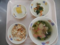 本日の給食は… *おこわ風ごはん <米・にんじん・たけのこ・干ししいたけ・しょうゆ・酒・みりん・和風だしの素> *博多雑煮風汁 <あごだし汁・干ししいたけ・かまぼこ・にんじん・ごぼう・鶏もも肉・だいこん・小松菜・酒・みりん・しょうゆ> *ほうれん草と厚揚げの和え物 <ほうれん草・にんじん・生揚げ・かつおだし汁・しょうゆ・かつお節> *バナナ 本日のかみかみ期の離乳食は… ○ごはん ○博多雑煮風汁 <あごだし汁・干ししいたけ・にんじん・鶏もも肉・だいこん・小松菜・しょうゆ> ○ほうれん草とにんじんの和え物 ...