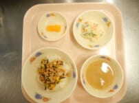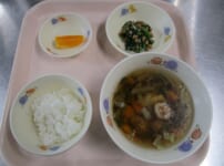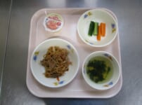 本日の給食は… *開拓丼 〈米・豚ひき肉・高野豆腐・大豆水煮・たまねぎ・にんじん・コーン・枝豆・ひじき・おろししょうが・おろしにんにく・あぶら・白みそ・しょうゆ・みりん・三温糖〉 *ポテトサラダ 〈じゃがいも・きゅうり・にんじん・コーン・マヨドレ・塩・三温糖〉 *みそ汁(白菜・かまぼこ) *オレンジ 本日のおやつは… ◆牛乳 ◆八つ橋 〈白玉粉・上新粉・三温糖・水・きな粉・塩・こしあん〉 本日のもぐもぐ期の離乳食は… 〇軟飯 〇そぼろ煮 〈高野豆腐・ひき肉・たまねぎ・にんじん・砂糖・しょうゆ〉 〇スティッ ...