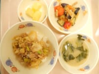 本日の給食は… *豚丼 〈米・キャベツ・豚もも肉・豚バラ肉・玉ねぎ・醤油・酒・みりん・三温糖・枝豆〉 *なすの揚げびたし 〈なす・赤ピーマン・なたね油・油揚げ・人参・ごま油・中華だしの素・醤油・酒・みりん・三温糖・ねぎ〉 *みそ汁 〈白みそ・煮干だし汁・小松菜・えのき〉 *パイン 本日のおやつは… ◆牛乳 ◆きな粉マカロニ 〈マカロニ・きな粉・三温糖・塩〉 本日のかみかみ期離乳食は… ○軟飯 ○豚肉の煮物 〈豚肉・人参・玉ねぎ・醤油・三温糖・かつお昆布だし汁〉 ○なすの揚げびたし 〈なす・赤ピーマン・なた ...