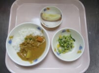 本日の給食は… *ごはん *ポークカレー <豚肉・玉葱・人参・じゃがいも・グリンピース・油・バター・牛乳・スキムミルク・カレールウ・ソース・ケチャップ・小麦粉> *フレンチサラダ <キャベツ・きゅうり・コーン・塩・酢・砂糖・油・白ごま> *りんご 本日のおやつは… ◆牛乳 ◆ミニクロワッサン 本日のかみかみ期の離乳食は… ★軟飯 ★野菜シチュー <豚肉・玉葱・人参・じゃがいも・バター・豆乳> ★フレンチサラダ <キャベツ・きゅうり> ★りんご 本日のかみかみ期のおやつは… ☆麦茶 ☆マンナビスケット ☆オ ...