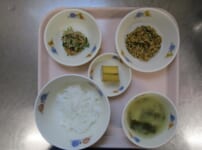 本日の給食は… *ご飯 *さばの生姜焼き 〈さば・おろししょうが・三温糖・酒・みりん・しょうゆ〉 *きんぴらごぼう 〈ごぼう・人参・豚もも肉・ごま油・三温糖・しょうゆ・みりん・酒・ごま〉 *みそ汁 〈白みそ・煮干だし汁・えのき・キャベツ〉 *パイン 本日のおやつは… ◆牛乳 ◆チーズドッグ 〈ホットケーキミックス・絹豆腐・モッツァレラチーズ・小麦粉・パン粉・油・ケチャップ・グラニュー糖〉 本日のもぐもぐ期離乳食は… ◎粥 ◎高野豆腐の煮物 〈高野豆腐・えのき・キャベツ・三温糖・しょうゆ〉 ◎スティック人参 ...