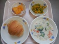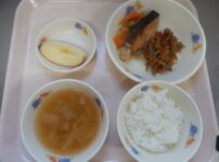 本日の給食は… *わかめごはん *北海かき揚げ 〈さけ・ホタテ貝柱・グリーンアスパラ・コーン・たまねぎ・小麦粉・片栗粉・塩・油〉  *ひじきの炒め煮 〈ひじき・切り干し大根・にんじん・たまねぎ・さつま揚げ・小松菜・油・三温糖・しょうゆ・酒・みりん〉 *みそ汁(キャベツ・えのき) *バナナ 本日のおやつは… ◆牛乳 ◆ババロア 〈牛乳・生クリーム・粉かんてん・グラニュー糖〉 本日のもぐもぐ期の離乳食は… 〇軟飯 〇鮭の煮物 〈鮭・たまねぎ・しょうゆ〉 〇スティックにんじん 〈にんじん・塩〉 〇スープ 〈キャ ...