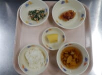 本日の給食は… *ごはん *鶏肉のマーマレード煮 <鶏肉・玉葱・塩・おろしにんにく・マーマレード・醤油・酒・みりん・三温糖・水> *ほうれん草の白和え <ほうれん草・人参・絹豆腐・すりごま・しょうゆ・三温糖・和風だしの素・塩> *みそ汁(ごぼう・人参・里芋) *パイン 本日のおやつは… ◆牛乳 ◆レアチーズ風クラッカー <クラッカー・レモン汁・生クリーム・上白糖・クリームチーズ・白桃缶> 本日のもぐもぐ期の離乳食は‥ 〇軟飯 〇豆腐の煮物 <豆腐・ほうれん草> 〇南瓜のマッシュ 〇スープ 本日のかみかみ期 ...