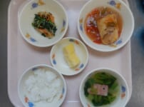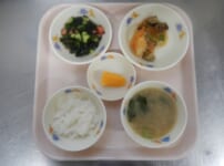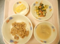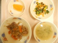 本日の給食は… *牛丼 〈米・牛もも・牛ばら・白菜・しらたき・たまねぎ・人参・ねぎ・おろししょうが・しょうゆ・酒・三温糖・みりん〉 *小松菜のガーリック炒め 〈小松菜・人参・しめじ・コーン・オリーブ油・にんにく・コンソメ・塩〉 *みそ汁 〈白みそ・煮干だし汁・ちくわ・あおさ・じゃがいも〉 *オレンジ 本日のおやつは… ◇牛乳 ◇照り焼きチキントースト 〈食パン・鶏もも肉・おろししょうが・しょうゆ・みりん・三温糖・マヨドレ・とろけるチーズ・焼きのり〉 本日のもぐもぐ期離乳食は… ◆軟飯 ◆牛肉の煮物 〈牛肉 ...