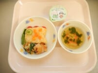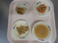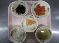 本日の給食は… *人参ごはん 〈米・にんじん・しょうゆ・酒・みりん・かつお昆布だし・洋風だしの素・バター〉 *鶏のみそ焼き 〈鶏もも肉・しょうゆ・みりん・酒・白みそ・三温糖・おろししょうが・おろしにんにく〉 *ほうれん草のごま和え 〈ほうれん草・にんじん・ちくわ・ごま・しょうゆ・三温糖〉 *ミニトマト・きゅうり *すまし汁(えのきたけ・かまぼこ・みつば) *こどもの日デザート 本日のおやつは… ◆牛乳 ◆じゃこトースト 〈食パン・しらす干し・あおのり・マヨドレ・粉チーズ・三温糖〉 &nbs ...