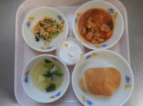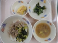 本日の給食は・・・ *ねぎ塩豚丼 〈米・豚肉・玉ねぎ・にんにく・小松菜・酒・ごま油・ねぎ・塩・レモン果汁・中華だしの素〉 *きゅうりとわかめの酢の物 〈きゅうり・わかめ・醤油・酢・三温糖・塩・ごま油〉 *みそ汁 〈白みそ・煮干しだし汁・さつまいも・玉ねぎ・しめじ〉 *バナナ 本日のおやつは・・・ ◆牛乳 ◆あんぱん 〈強力粉・ドライイースト・三温糖・塩・牛乳・無塩バター・こしあん・黒ごま〉 本日のもぐもぐ期の給食は・・・ *軟飯 *豚肉の煮物 〈豚肉・玉ねぎ・小松菜・醤油・三温糖・塩〉 *ふかしさつまいも ...