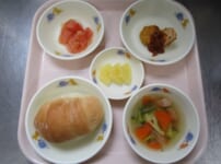 本日の給食は… *ロールパン *ハンバーグ <木綿豆腐・豚ひき肉・玉ねぎ・人参・パン粉・塩・玉葱・バター・小麦粉・ケチャップ・ソース・ウスターソース・しょうゆ> *トマトサラダ <トマト・玉葱・オリーブ油・おろしにんにく・酢・砂糖・パセリ粉> *ポトフ <玉葱・人参・ウインナー・ブロッコリー・水・コンソメ・塩> *パイン缶 本日のおやつは… ◆牛乳 ◆バナナパウンドケーキ <バナナ・砂糖・油・ホットケーキ・きな粉> 本日のモグモグ期の離乳食は… 〇スティックパン <ロールパン> 〇玉ねぎの白和え <玉ねぎ ...