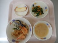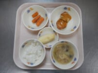本日の給食は… *ごはん *甘辛つくね <鶏ひき肉・木綿豆腐・玉ねぎ・れんこん・おろししょうが・片栗粉・マヨドレ・酒・醤油・パン粉・みりん・醤油・三温糖・片栗粉> *ごま人参 <人参・油・すりごま・醤油・三温糖> *みそ汁(油揚げ・キャベツ・しめじ) *バナナ 本日のおやつは… ◆牛乳 ◆ナポリうどん <うどん・油・玉ねぎ・ピーマン・ウインナー・ケチャップ・ソース・牛乳・バター・粉チーズ> 本日のかみかみ期の離乳食は… 〇軟飯 〇甘辛つくね <鶏ひき肉・木綿豆腐・玉ねぎ・片栗粉・醤油・三温糖・片栗粉> 〇 ...