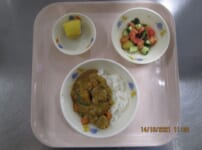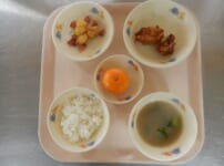 本日の給食は… *ごはん *豚肉のから揚げ <豚ヒレ肉・醤油・酒・みりん・おろしにんにく・おろししょうが・片栗粉・小麦粉・油・キャベツ・きゅうり・人参・塩> *ジャーマンポテト <じゃがいも・ウインナー・ベーコン・にんにく・油・コンソメ・塩・パセリ> *みそ汁(もやし・まいたけ・小松菜) *みかん 本日のおやつは… ◆牛乳 ◆ヨーグルトムース <ヨーグルト・生クリーム・グラニュー糖・ゼラチン・水・レモン汁・ビスケット・バター> 本日のかみかみ期の離乳食は… 〇ごはん 〇豚肉のから揚げ湯通し <豚ヒレ肉・醤 ...