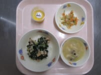 本日の給食は… *焼き鳥丼 <ごはん・鶏肉・ねぎ・砂糖・しょうゆ・みりん・片栗粉・水・のり・ほうれん草> *だいこんサラダ <大根・人参・きゅうり・ツナ・しょうゆ・砂糖・酢・ごま油> *みそ汁(油揚げ・しめじ・キャベツ) *秋のプリンアラモード <かぼちゃ・牛乳・砂糖・ゼラチン・生クリーム・砂糖・生クリーム・ココアパウダー・水> 本日のおやつは… ◆牛乳 ◆チーズドッグ <ホットケーキミックス・絹ごし豆腐・チーズ・油・グラニュー糖・ケチャップ> 本日のごっくん期の離乳食は… ●つぶし粥 ●ペースト <ほう ...