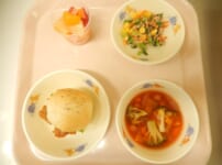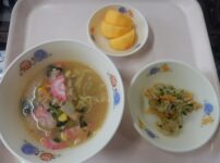 本日の給食は… *チャイニーズチキンバーガー 〈中力粉・ドライイースト・塩・三温糖・牛乳・バター・ごま・鶏もも肉・塩・酒・しょうが・にんにく・小麦粉・片栗粉・なたね油・醤油・三温糖・酢・みりん・レタス・マヨドレ〉 *コーンツナサラダ 〈コーン・小松菜・ツナ水煮・人参・三温糖・塩・酢・なたね油〉 *ミネストローネ 〈トマトジュース・じゃが芋・ブロッコリー・人参・玉ねぎ・ウインナー・塩・コンソメ・三温糖〉 *カルピスフルーツポンチ 〈パイン缶・みかん缶・いちご・カルピス〉 本日のおやつは… ◆牛乳 ◆みそ焼き ...