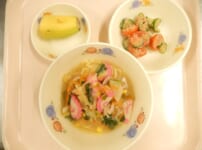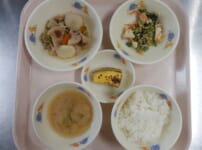 本日の給食は… *みそラーメン 〈生中華麺・なたね油・豚もも肉・キャベツ・もやし・人参・玉ねぎ・ねぎ・小松菜・なると・コーン・鶏がらだし汁・バター・かつお・昆布だし汁・中華だしの素・白みそ・生姜・にんにく・ごま油・焼きのり〉 *ミニトマトとツナの中華サラダ 〈ミニトマト・きゅうり・ツナ水煮・ごま油・醤油・中華だしの素・ごま〉 *バナナ 今日のおやつは… ◆牛乳 ◆ねぎみそ焼きおにぎり 〈米・万能ねぎ・白みそ・みりん・ごま油・三温糖・醤油・ごま〉 本日のもぐもぐ期離乳食は… 〇粥 〇豚肉と野菜の煮物 〈豚肉 ...