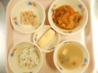 本日の給食は・・・ ◆五目うどん 〈干しうどん・かつお昆布だし・醤油・みりん・酒・食塩・鶏もも肉・人参・干し椎茸・なると・小松菜・大根・ねぎ〉 ◆コーンとしらすのかき揚げ 〈コーン・しらす・玉ねぎ・三つ葉・片栗粉・米粉・ベーキングパウダー・なたね油〉 ◆フルーツヨーグルト 〈いちご・パイン缶・みかん缶・ヨーグルト・三温糖〉 本日のおやつは… 〇麦茶 〇焼肉おにぎり 〈米・牛バラ肉・ひじき・枝豆・おろしにんにく・おろししょうが・醤油・みりん・三温糖・ごま油・ごま〉