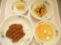 本日の給食は… ◎ドライカレー <豚ひき肉・人参・玉ねぎ・トマト缶・おろししょうが・カレールウ・カレー粉・ケチャップ・中濃ソース・コンソメ・バター> ◎コーンソテー <しめじ・コーン・バター・醤油> ◎白菜のコンソメスープ <白菜・絹ごし豆腐・人参・コンソメ・酒・塩> ◎バナナ 本日のおやつは… ■牛乳 ■せんべい