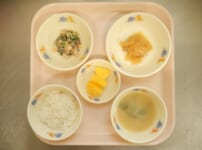 本日の給食は… *ごはん *高野豆腐と豚肉の煮物 〈高野豆腐・豚ばら肉・豚もも肉・たまねぎ・しらたき・かつお昆布だし・しょうゆ・みりん・酒・三温糖・食塩〉 *小松菜の納豆和え 〈小松菜・にんじん・ひきわり納豆・しょうゆ・三温糖・焼きのり〉 *みそ汁(キャベツ・しめじ) *オレンジ 本日のおやつは… ◆牛乳 ◆チーズ蒸しパン 〈ホットケーキ粉・ベーキングパウダー・三温糖・牛乳・バター・粉チーズ・クリームチーズ〉 本日のかみかみ期の離乳食は… 〇ごはん 〇高野豆腐と豚肉の煮物 〈高野豆腐・豚ばら肉・豚もも肉・ ...