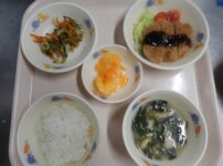 本日の給食は・・・ *ごはん *ヒレカツ 〈豚ヒレ肉・塩・米粉・パン粉・中濃ソース・三温糖・キャベツ・ミニトマト〉 *白菜の海苔和え 〈白菜・きゅうり・にんじん・かまぼこ・焼きのり・醤油・三温糖〉 *みそ汁 〈白みそ・煮干しだし汁・ほうれん草・里芋・油揚げ〉 *柿 本日のおやつは・・・ ◆牛乳 ◆オレンジムース 〈ヨーグルト・生クリーム・三温糖・ゼラチン・みかん缶・みかんジュース〉
