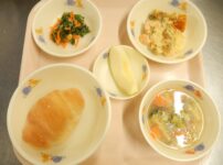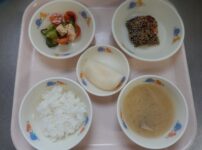 本日の給食は・・・ *えび天むす 〈米・えび・小麦粉・塩・みりん・醤油・かつおだし・三温糖・焼きのり〉 *ほうれん草のおかか和え 〈ほうれん草・キャベツ・にんじん・ちくわ・かつお節・醤油〉 *みそ汁 〈白みそ・煮干しだし汁・かぼちゃ・さつま芋・厚揚げ〉 *バナナ 本日のおやつは・・・ ◆牛乳 ◆米粉お好み焼き 〈豚もも肉・キャベツ・長芋・片栗粉・米粉・ほんだし・スキムミルク・かつお節・青のり・マヨドレ・お好み焼きソース〉