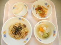 本日の給食は・・・ *和風スパゲティ 〈スパゲティ・鶏もも肉・ベーコン・玉ねぎ・にんじん・しめじ・しいたけ・ピーマン・塩・バター・醤油・みりん・オリーブ油・にんにく・焼きのり〉 *カリカリサラダ 〈ワンタンの皮・キャベツ・きゅうり・にんじん・コーン・醤油・酢・三温糖〉 *長芋ポトフ 〈長芋・木綿豆腐・ブロッコリー・にんじん・コンソメ・塩〉 *梨 本日のおやつは・・・ ◆牛乳 ◆大学芋 〈さつまいも・塩・醤油・三温糖・みりん・黒ごま〉