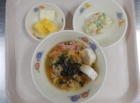 本日の給食は・・・ *醤油ラーメン 〈麺・豚バラ肉・白菜・玉ねぎ・にんじん・ねぎ・小松菜・もやし・なると・焼き麩・生姜・にんにく・焼きのり・鶏ガラだし・かつお昆布だし・中華だし・醤油〉 *ポテトサラダ 〈じゃがいも・きゅうり・にんじん・ハム・コーン・マヨドレ・三温糖・塩〉 *パインとチーズ 〈パイン・ベビーチーズ〉 本日のおやつは・・・ ◆麦茶 ◆パエリア 〈米・えび・あさり・玉ねぎ・赤ピーマン・にんじん・バター・にんにく・塩・コンソメ・パセリ粉〉 本日の完了期のおやつは・・・ ◆麦茶 ◆パエリア風 〈米 ...