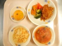 本日の給食は・・・ *にんじんピラフ 〈米・にんじん・白だし・コンソメ・バター〉 *クリスピーチキン 〈鶏もも肉・塩・コーンフレーク・マヨドレ・コンソメ・にんにく・小麦粉〉 *野菜のオーブン焼き 〈かぼちゃ・ブロッコリー・赤ピーマン・オリーブ油・ガーリックパウダー・塩〉 *ミネストローネ 〈トマトジュース・キャベツ・にんじん・玉ねぎ・じゃがいも・小松菜・ベーコン・塩・コンソメ・三温糖〉 *みかん 本日のおやつは・・・ ◆牛乳 ◆りんごのフルーツゼリー 〈りんごジュース・三温糖・ゼラチン・みかん缶・もも缶・ ...