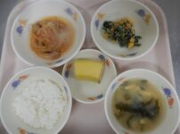 本日の給食は… ◆ごはん ◆鶏肉のマーマレード煮 〈鶏もも肉・ママレード・醤油・酒・みりん・玉ねぎ〉 ◆ほうれん草のごま和え 〈ほうれん草・人参・コーン・すりごま・醤油・三温糖〉 ◆みそ汁 〈白みそ・かつおだし汁・大根・高野豆腐・わかめ〉 ◆バナナ