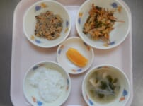 本日の給食は・・・ *ごはん *鶏肉のみぞれ煮 〈鶏肉・片栗粉・大根・醤油・三温糖・みりん・生姜・かつお昆布だし・万能ねぎ〉 *きんぴらごぼう 〈ごぼう・にんじん・豚肉・ごま油・三温糖・みりん・醤油・酒・ごま〉 *みそ汁 〈白みそ・煮干しだし汁・ほうれん草・さといも・油揚げ〉 *りんご 本日のおやつは・・・ ◆牛乳 ◆さくらんぼゼリー 〈さくらんぼ缶・アセロラジュース・粉寒天・三温糖〉 本日のもぐもぐ期の給食は・・・ *粥 *鶏肉のみぞれ煮 〈鶏肉・醤油・三温糖・片栗粉・大根〉 *にんじんの和え物 〈にん ...