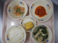 本日の給食は… *わかめごはん 〈米・炊きこみわかめ〉 *れんこんつくね 〈鶏ひき肉・木綿豆腐・高野豆腐・玉ねぎ・れんこん・ねぎ・しょうが・片栗粉・パン粉・酒・しょうゆ・みりん・三温糖〉 *春雨サラダ 〈春雨・ハム・人参・きゅうり・ブロッコリー・三温糖・酢・中華だしの素・ごま油・ごま〉 *豆腐のすまし汁 〈かつお昆布だし汁・塩・しょうゆ・絹ごし豆腐・にら・かまぼこ〉 *パイン 本日のおやつは… ◆牛乳 ◆長芋の磯部揚げ 〈長芋・片栗粉・あおのり・焼きのり・なたね油・塩・しょうゆ〉 本日のもぐもぐ期離乳食は ...