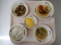 本日の給食は… *五目うどん 〈干しうどん・鶏もも肉・油揚げ・干し椎茸・かまぼこ・ねぎ・人参・かつお昆布だし・醤油・酒・みりん・塩〉 *ほうれん草とベーコンの炒め物 〈ほうれん草・ベーコン・なたね油・醤油〉 *かぼちゃの甘煮 〈かぼちゃ・醤油・三温糖・酒・みりん〉 *パイン 本日のおやつは… ◆牛乳 ◆焼きいも