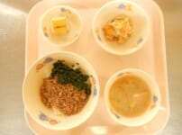 本日の給食は… *ごはん *鶏のさっぱり煮 〈鶏もも肉・おろししょうが・しょうゆ・三温糖・酢〉 *ブロッコリーのチーズおかか和え 〈ブロッコリー・にんじん・コーン・チーズ・かつお節・しょうゆ〉 *みそ汁 〈だいこん・カットわかめ・白みそ・煮干しだし汁〉 *バナナ 本日のおやつは… ◆牛乳 ◆お麩きな粉 〈焼ふ・バター・三温糖・きな粉〉