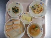 本日の給食は… *ごはん *鶏肉のマーマレード煮 〈鶏もも肉・玉ねぎ・醤油・酒・みりん・三温糖・おろしにんにく・マーマレード・水〉 *ほうれん草のごま和え 〈ほうれん草・人参・コーン・醤油・三温糖・すりごま〉 *みそ汁 〈煮干しだし汁・白みそ・大根・高野豆腐〉 *バナナ 本日のおやつは… ◆牛乳 ◆ラスク 〈食パン・バター・三温糖〉